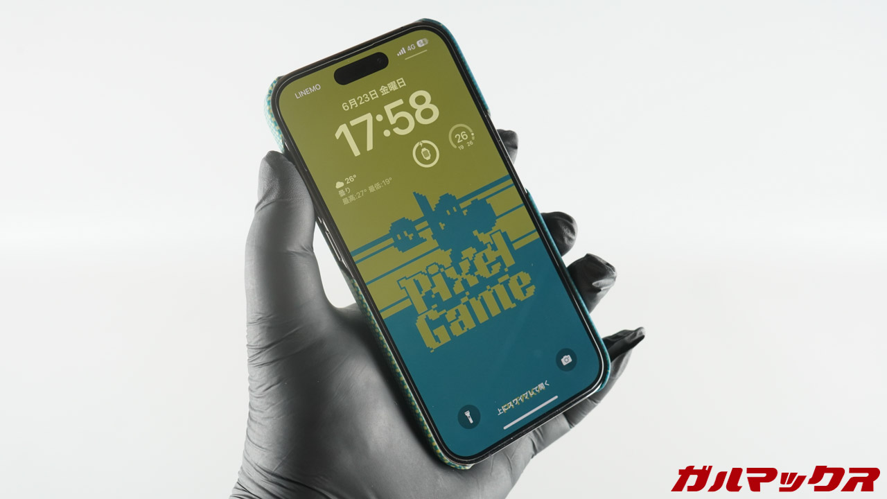 ▼iPhone 14 Proに装着するとこんな感じ。壁紙は公式サイトから複数のデザインをダウンロードできるようになっています。↓