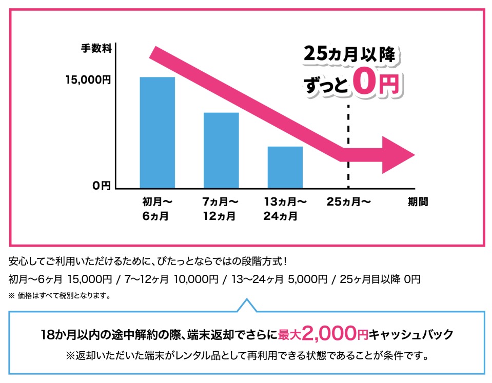 契約期間は24ヶ月なんですが、解約手数料は段階的に下がっていくタイプで自動更新はなし。25ヶ月目以降は解約手数料0円となってます。