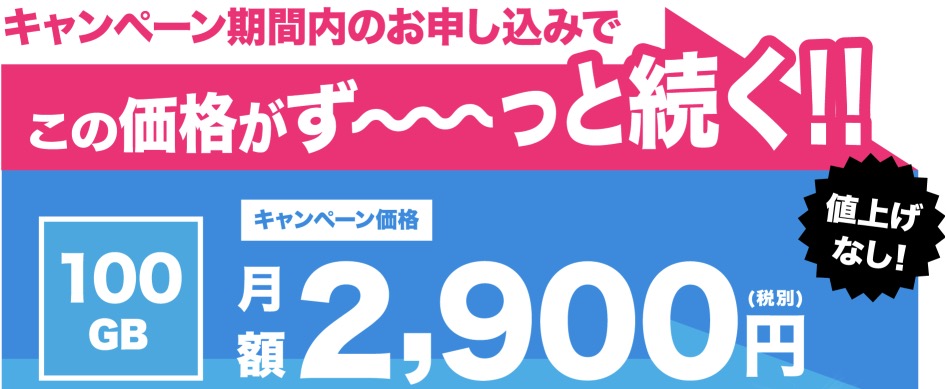 2021年1月31日(日)までの申込みで100GBプランが月額2,900円になるキャンペーンを開催中!
