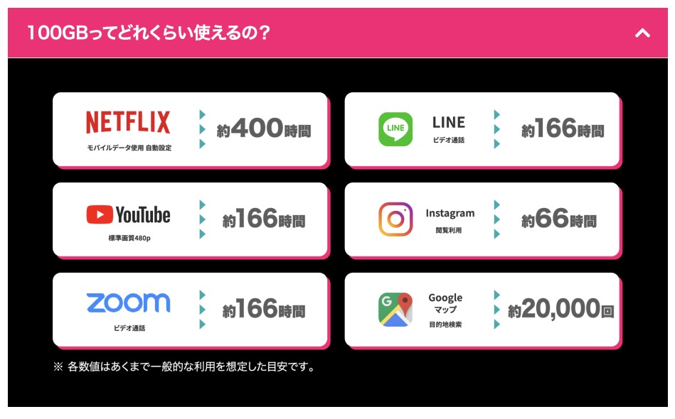 超大容量な100GB。たっぷり使えるので安心感ありますよね。どれくらい使えるのかってところなんですが、こんな感じだそうです。