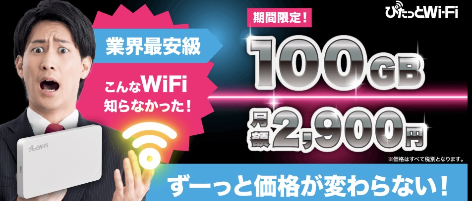 ぴたっとWi-Fiが新プランの100GBプランを発表。通常の利用料金は月額3,300円(税込3,630円)。大容量使えるルータプランを探している方は要チェック!