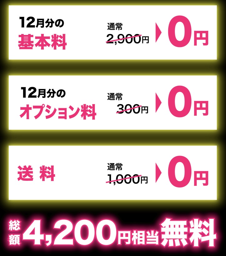 ▼さらに今なら12ヶ月分の基本料金0円、12月分のオプション料(端末保証)が0円、送料も0円の大盤振る舞い。↓