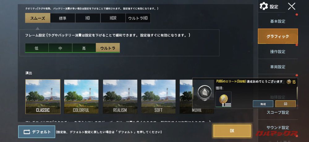 ▼PUBG Mobileはスムーズ+ウルトラまで設定可能でした!スムーズ+極限じゃなきゃ嫌だ!というガチゲーマーさんはゲーミングスマホとかが良いかもね!殆どの人は問題なくゲームも楽しめると思う!↓