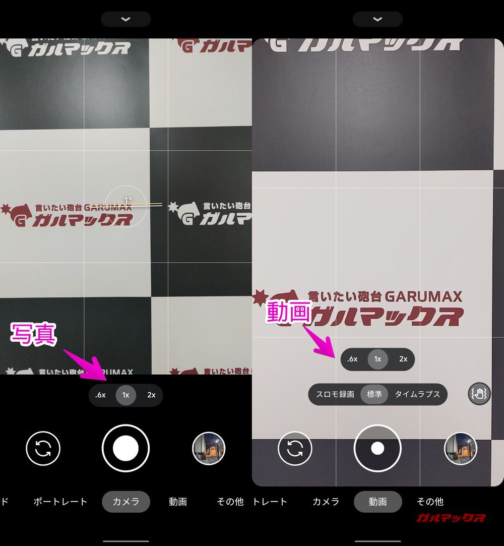 追記:レビュー中にカメラと動画撮影画面のUIに変化がありました。写真では0.6倍、1倍、2倍がワンタップで切り替えられるようになり、動画では倍率変更に加え撮影モードと手ブレ補正のアイコンが出てます。