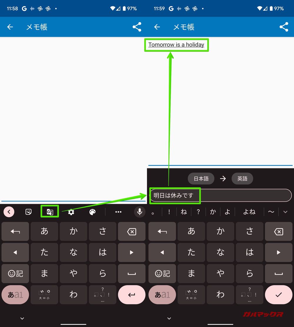 ▼文字入力のキーが出てきたら以下のアイコンをタップ。あとは日本語から英語など入力した段階で翻訳された内容をそのまま送ることができます。↓