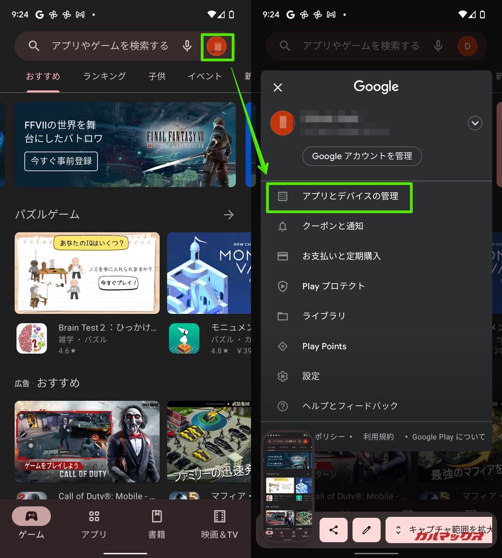 ▼アップデート方法は、Playストアを開いて「アカウントロゴ」をタップ、続いて「アプリとデバイスの管理」をタップします。↓