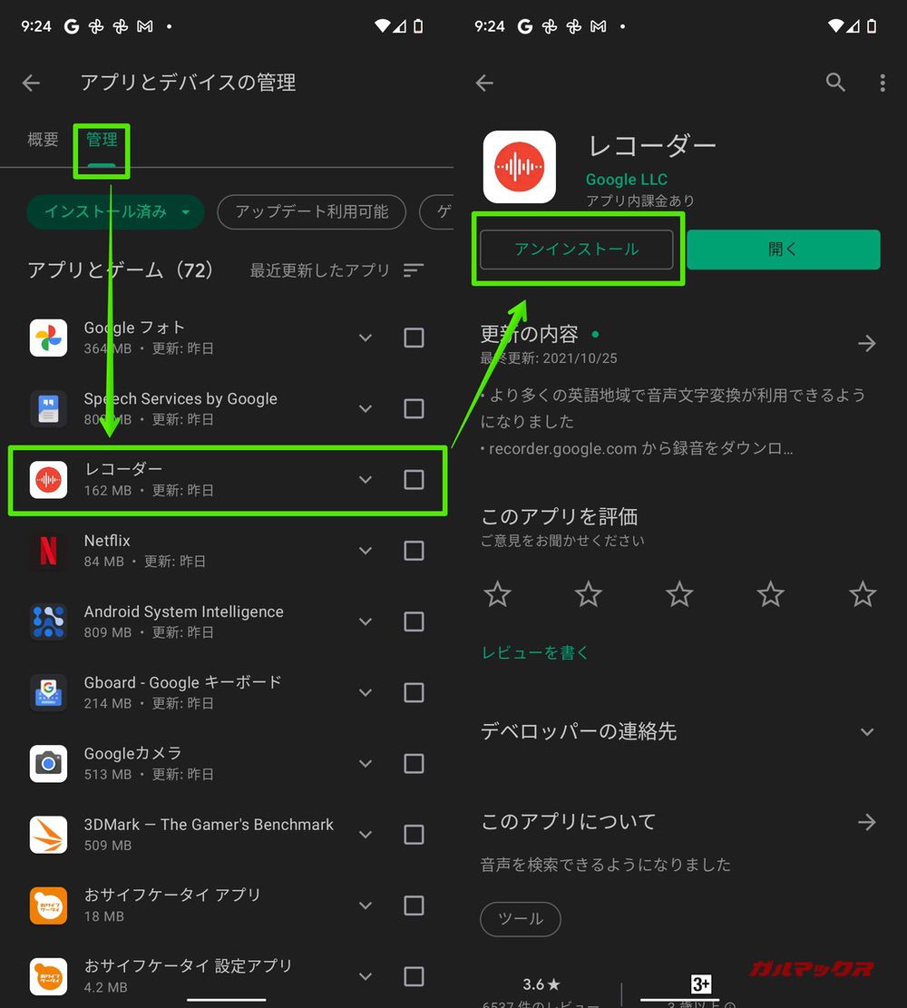 ▼「管理」タブからレコーダーをクリック。画像ではアンインストールの部分がアップデート対象ならアプデ表記になってるんでタップしてアップデートしましょう。↓