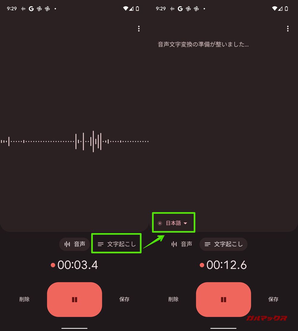 ▼レコーダーでの文字起こしは録音を開始してから「文字起こし」をタップするとOK。言語の変更もできるんで日本語に変更しましょう。あとは録音中の会話がリアルタイムで文字起こしされテキスト表示されます。↓
