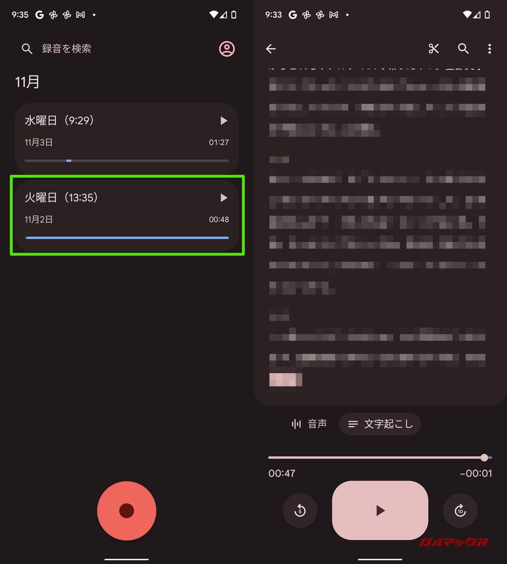 これね、もう業務端末かってくらい凄い機能なんですけど、ボイスレコーダーで録音した会話をリアルタイムで文字起こしできます。もちろん文字起こしテキストのコピペもOK。