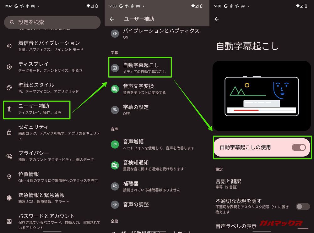 ▼まずは動画音声を文字起こしするために設定しましょう。スマホの設定→ユーザ補助→自動文字起こしをオンにします。↓