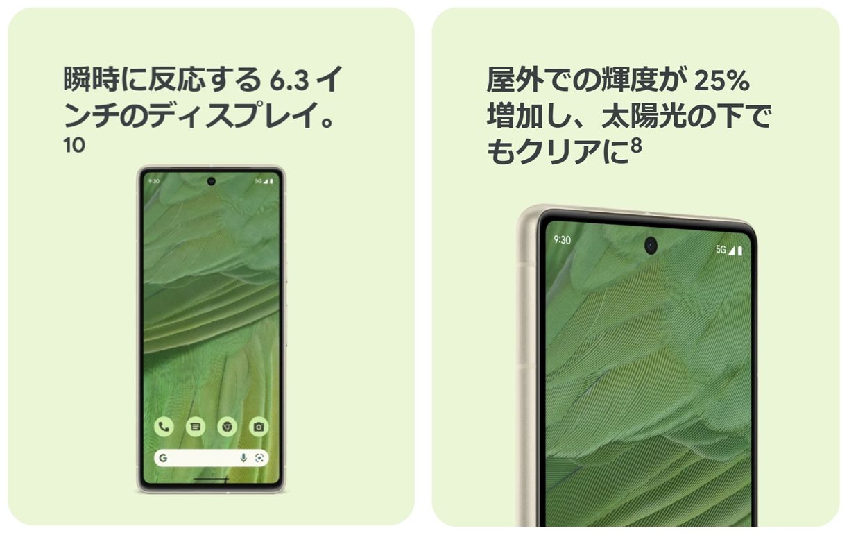 ▼Pixel 7のディスプレイサイズは6.3インチ。前モデルから引き続き最大90Hzの高リフレッシュレート対応の有機EL!輝度も25%アップで屋外でも見やすそうだな!↓