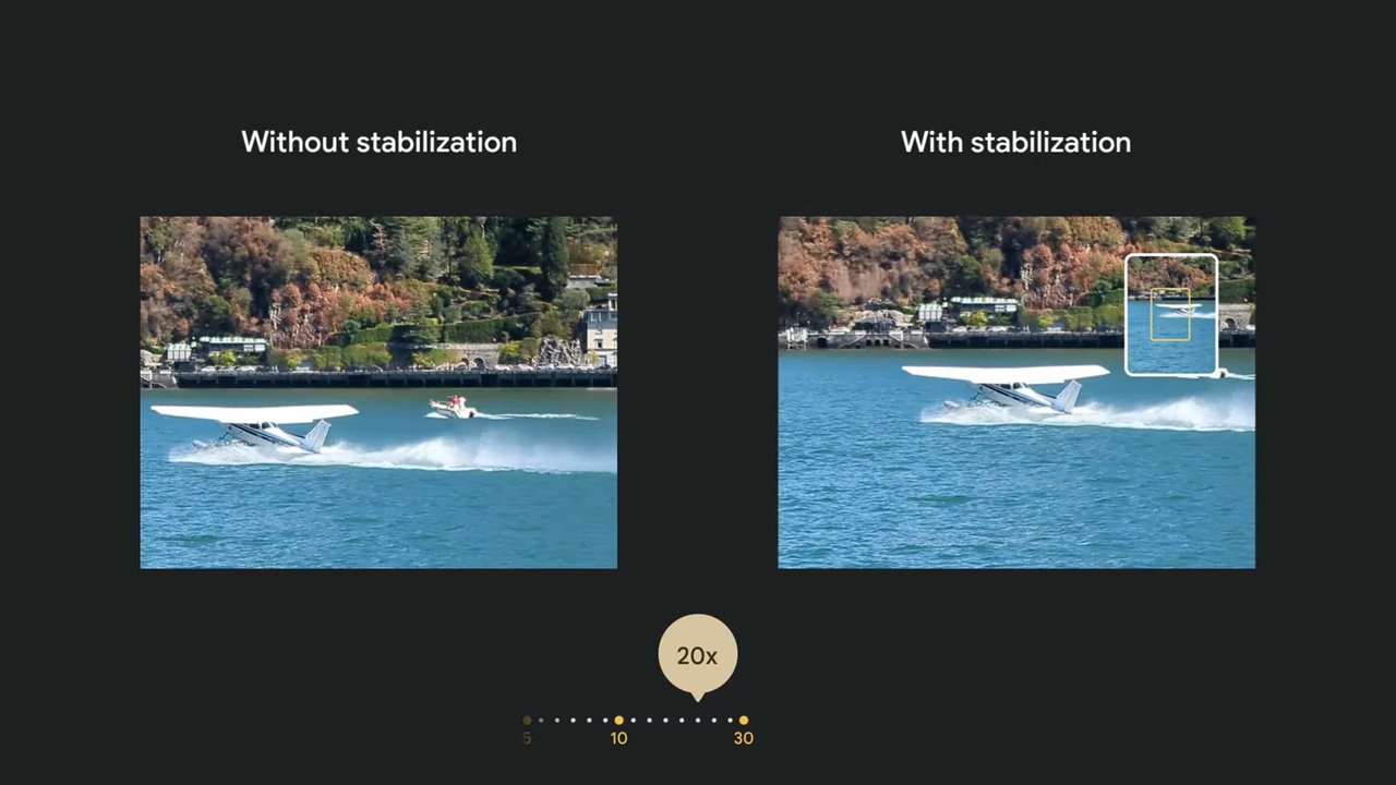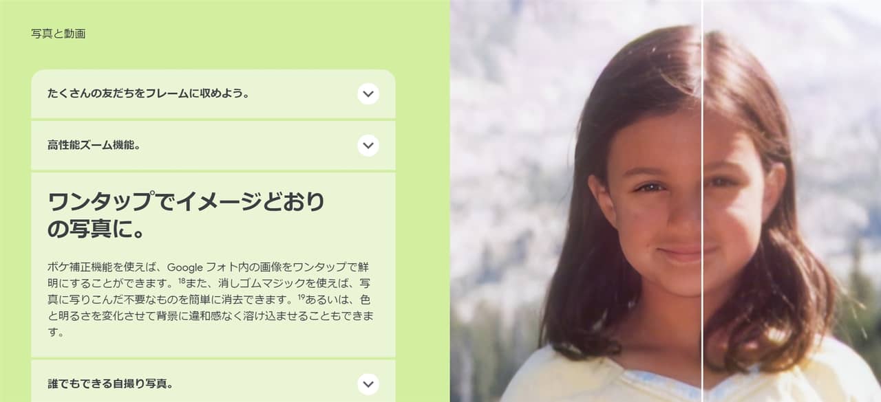 ▼これまでのPixel同様にTensorのAIを駆使した写真補正機能がウリ。光学2倍ズームに匹敵するレベルのズーム性能を誇り、またTensor G2のTPUを駆使することで撮影後にボケやブレの補正もOK。もちろん消しゴムマジック機能にもバッチリ対応!撮影から編集も楽しめそう。↓