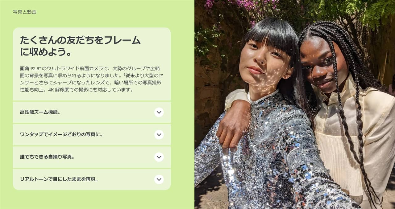▼フロントカメラは1,080万画素で、広範囲な92.8°の画角に対応。風景込みでの自撮りや、友達との自撮りも楽しめそうだな!↓![]()