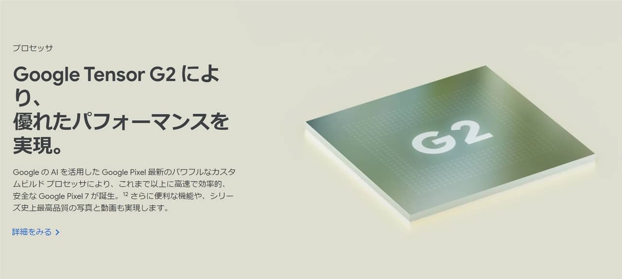 ▼SoCはGoogle独自のSoC「Tensor G2」を搭載!先代モデルのTensorはAIに特に優れたハイエンド級の処理性能だったが、さらに性能がアップ!ちなみに無印はメモリ(RAM)8GB!↓