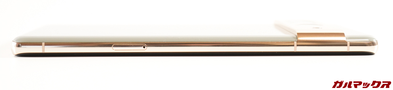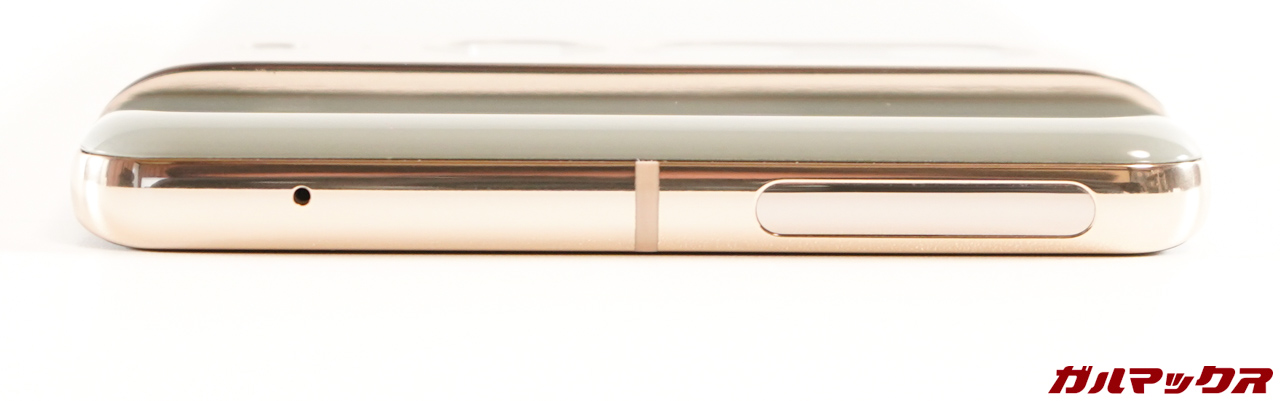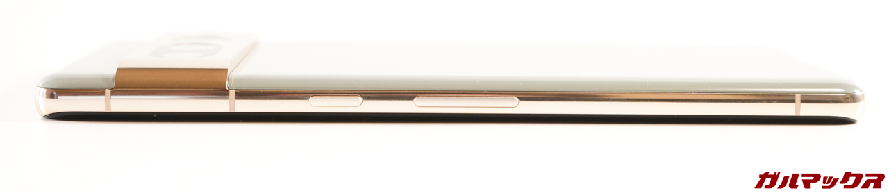 ▼右側面は音量ボタン、電源ボタンと並びます。一般的なAndroidスマホと逆配置。↓