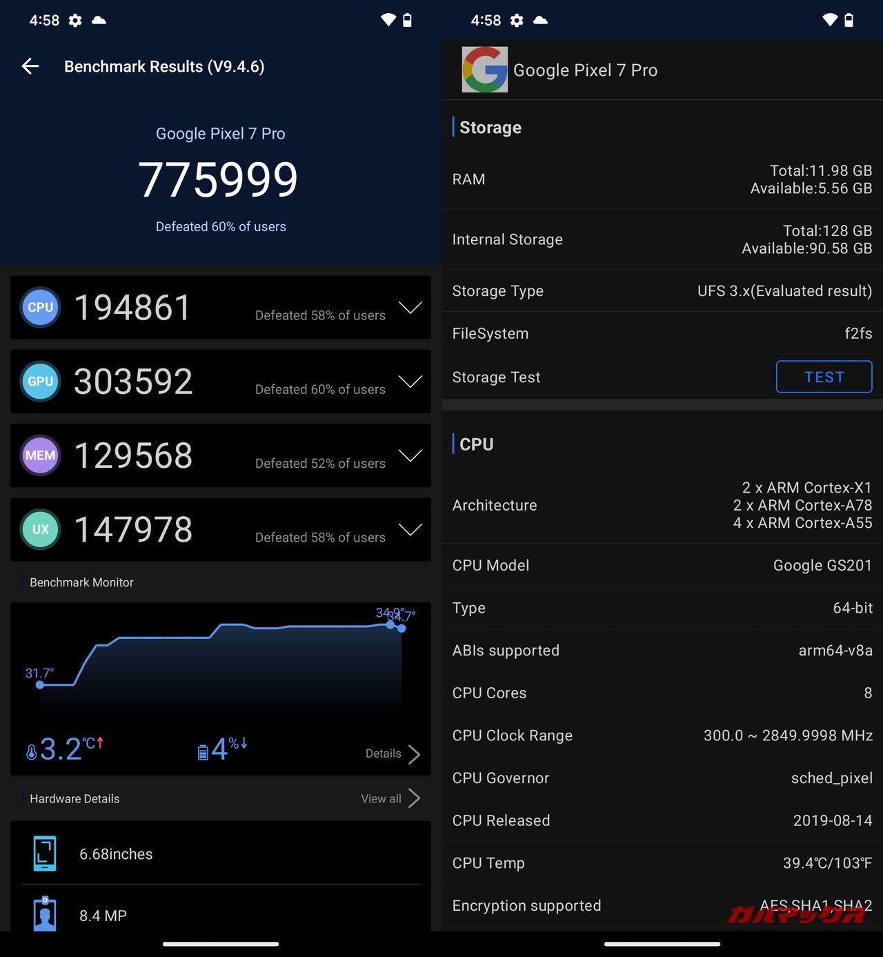 ▼Pixel 7 Proの実機AnTuTu(Ver9)スコアは総合が775,999点、GPUが303,592点でした。↓