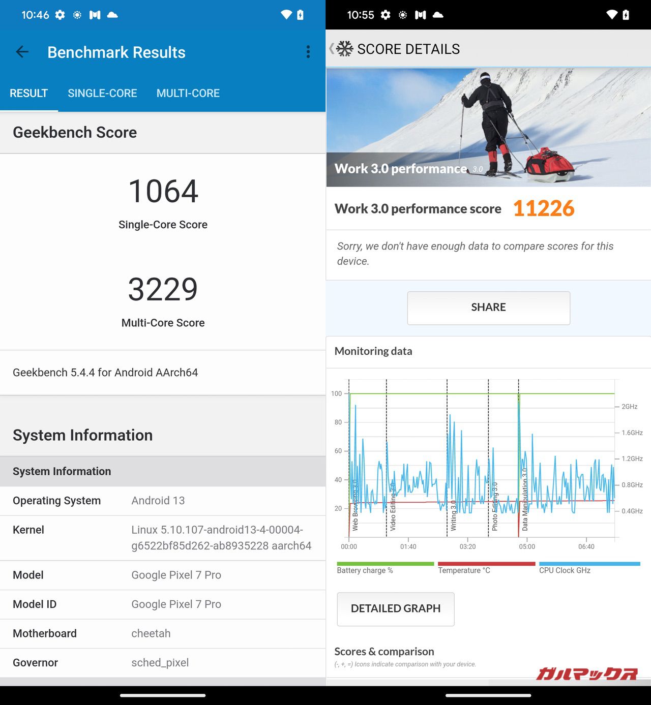 4Kであれば10分以下で停止するスマートフォンも多いのですが、10月中旬の気温でFHD/60FPSにて警告が出てしまったので、Tensor G2の発熱は懸念すべきポイントかと思います。