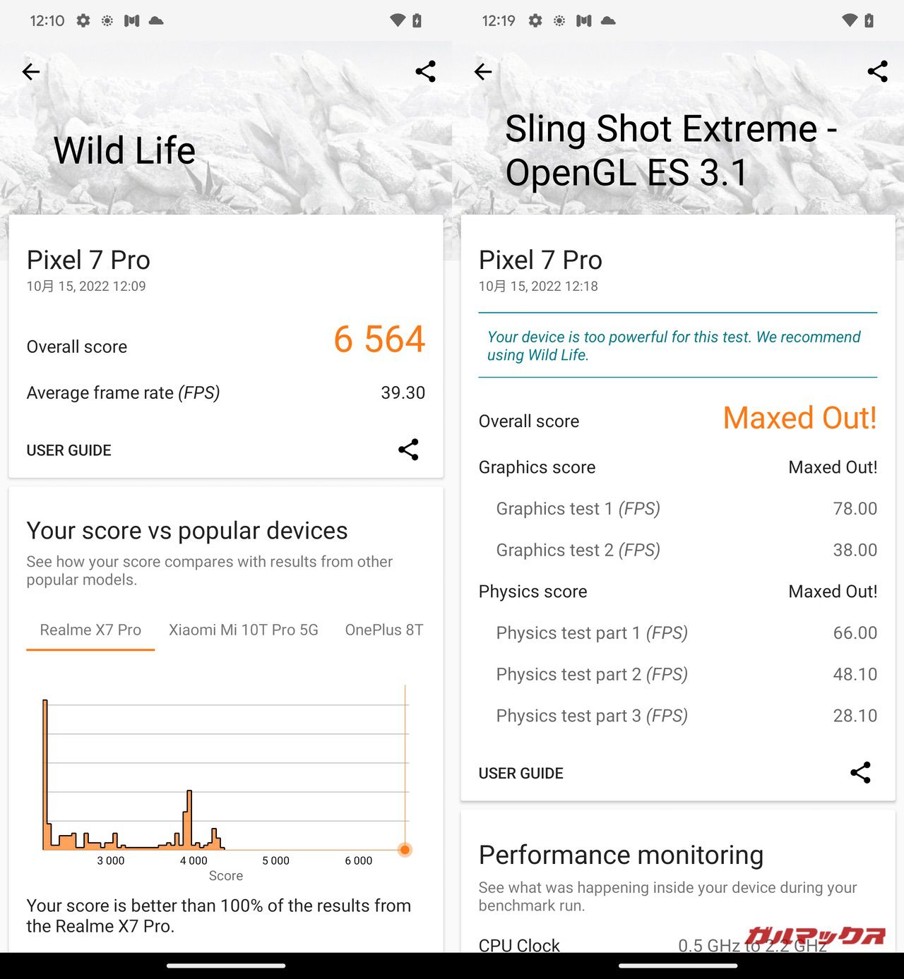 噂でTensor G2のゲーム性能はミドルハイクラスと言われていましたが、検証結果からその通りであると言わざるを得ません。このことから、グラフィック負荷の高いゲームをプレイしている方にPixel 7 Proは向きません。