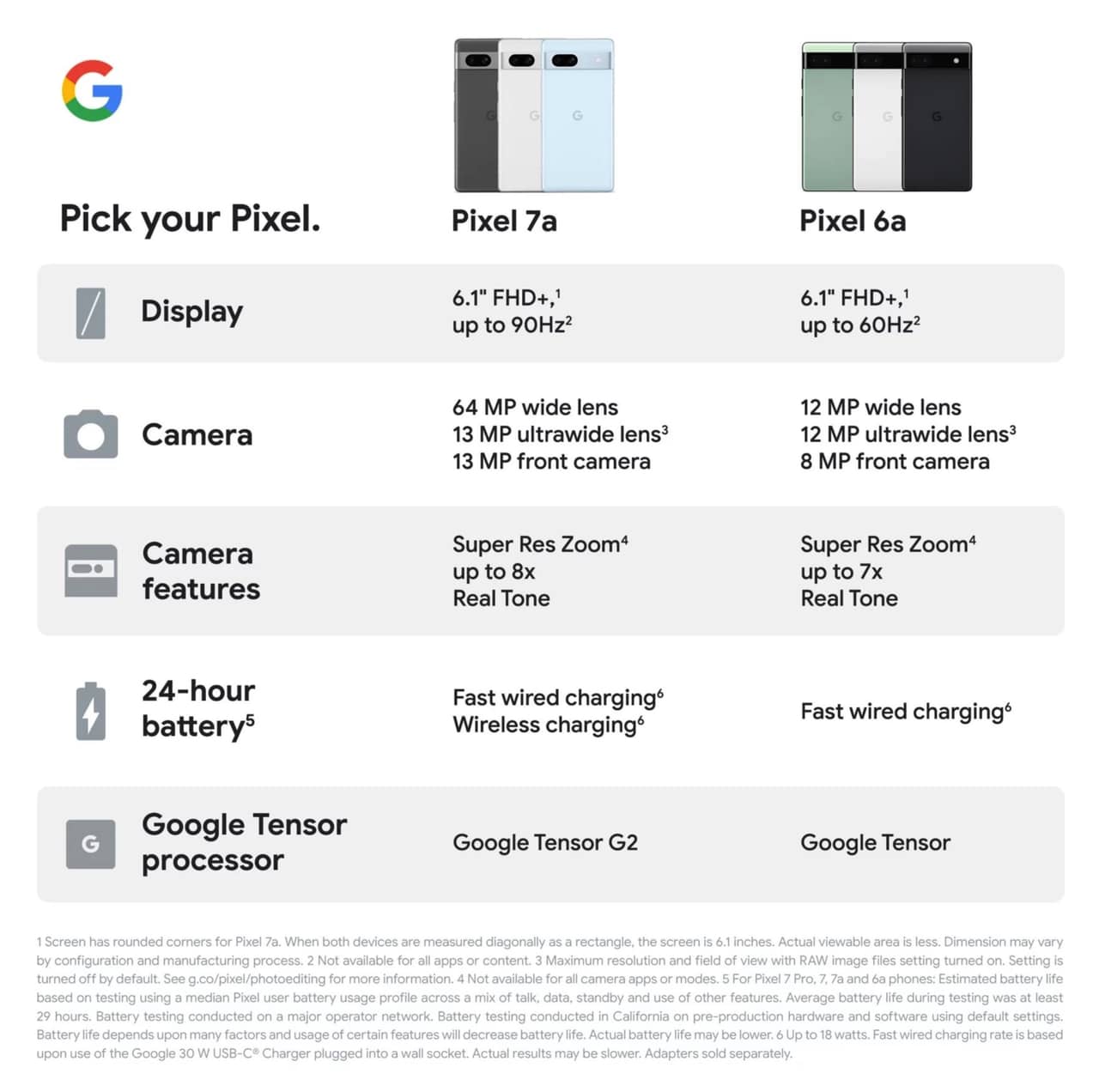 ▼2023/05/03追記:Pixel 7aとPixel 6aの公式比較画像が流出してるぞ!カメラは全部刷新されてるのか。付属品の画像も出たんだけどこっちは今まで通り。↓