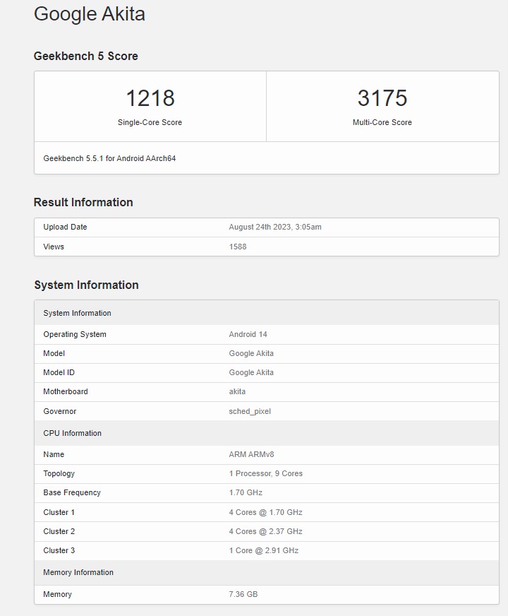 ▼また同メディアにてPixel 8aのGeekBench 5スコアも掲載していました。シングルコアは1,218点、マルチコアは3,175点。SoC自体はこれまで同様にTensor G3を搭載するようです。↓