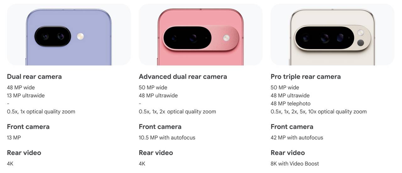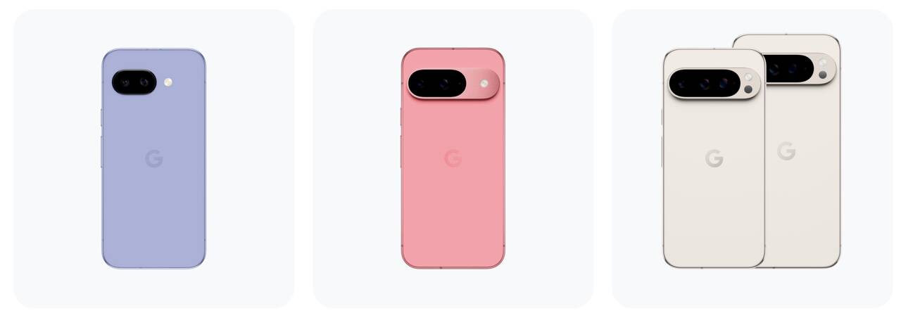 ▼Pixelらしさを感じるバー形状のカメラバンプが無くなったことで全体的に凄くシンプルな見た目に。左から9a、9、9 Proです。↓