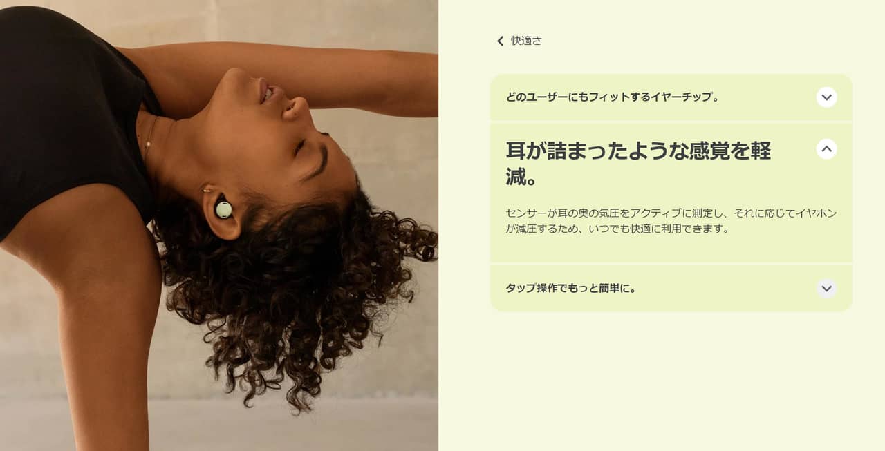 ▼イヤホンは人によっては耳づまり感などが気になる場合もありますが、なんとPixel Buds Proは耳の奥の気圧を検出して減圧してくれる機能も搭載!装着時の耳づまり感、違和感も軽減できるそうです!↓