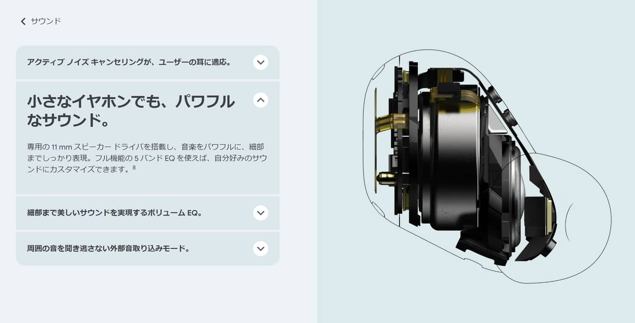 ▼11mm径の大きなドライバを採用しておりダイナミックでパワフルかつ細部のディテールもあるサウンドを楽しめるんだそう。↓