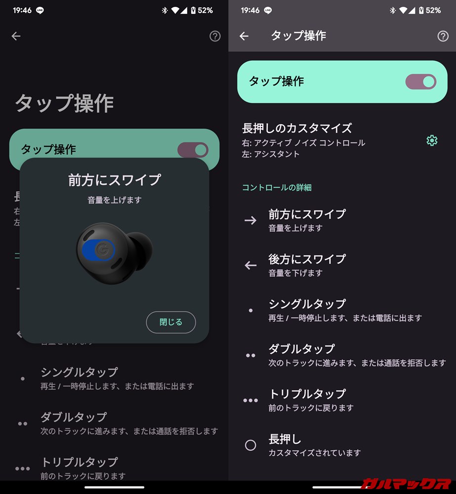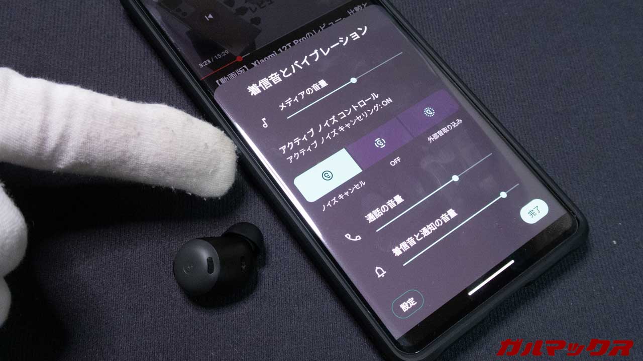 さらにPixel Buds A-Seriesにはなかった音量調節にも新たに対応し、前方向にスワイプすると音量を上げ、後ろ方向だと音量を下げられるようになっています。この部分も感度良好で自分の望むままに操作ができる。