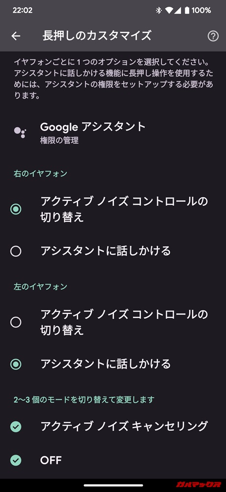 ▼長押しのみカスタマイズも対応しており、アシスタントを呼び出すかANCモードの切り替えか、あとANCモードの構成も変更することができます。カスタマイズ性が上がっているのは嬉しいポイント。↓