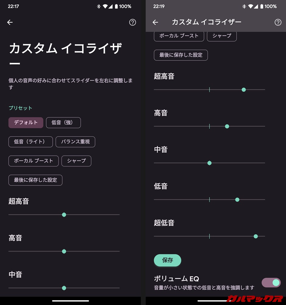 なんと低音だけでなく、超高音、高音、中音、低音、超低音の5つが調整できるようになっています。またプリセットも複数用意されていました。こりゃあすげぇぜ!