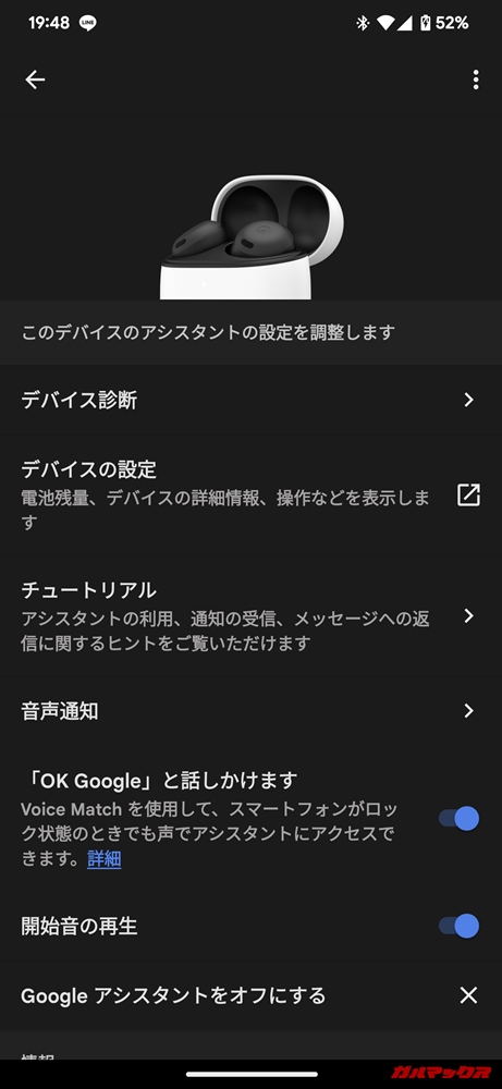 ANCオンで筆者が使った感じでは、満充電から2時間ちょっと使ってたら充電が52%になっとりました。単純計算すれば4時間、もって5時間ぐらいで電池切れるようだ。アシスタントさんのエネルギーは結構食うみたいっす。