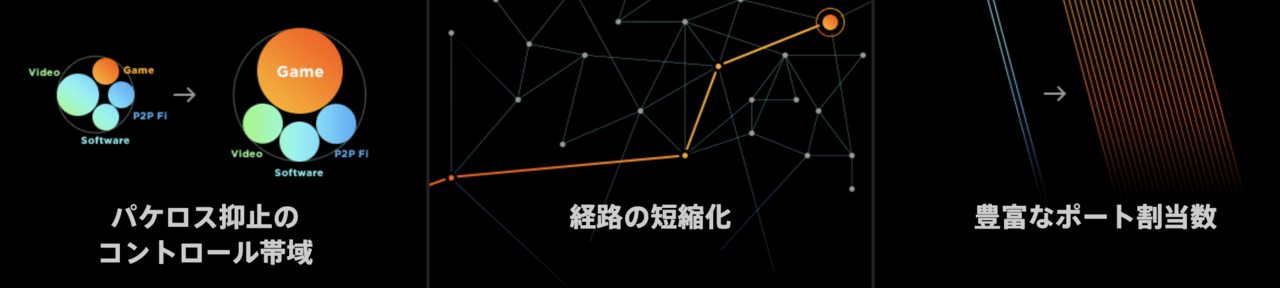 2つ目はゲームサーバーへの経路の短縮化。ゲームサーバーへの経路がながければ長いほど遅延するわけですが、その経路をズバッと短縮化することでこれまで以上に遅延を軽減するってわけです。従来プランに比べてホップ数を少なくしているとの事。