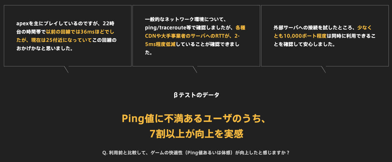 ▼実は、そんなゲーマーの声に応えるかのようにNTTぷららがゲーミングネットワークのβテストをしていたらしいんですが、7割以上がゲームの快適性が向上したと回答。↓