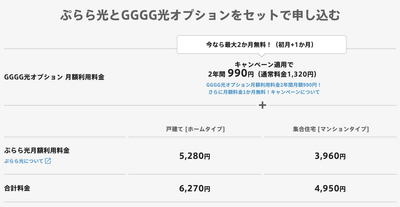 NTTぷららはGGGG光のサービス開始記念特別キャンペーンを開催してるんです!2022年5月31日までに申し込むと、24ヶ月間は月額990円で利用可能です!