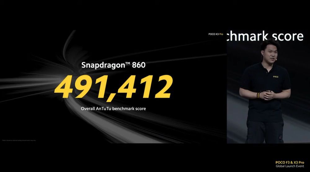 ▼発表会でAnTuTuの総合スコアが紹介された!Snapdragon 860の性能めっちゃ高い!