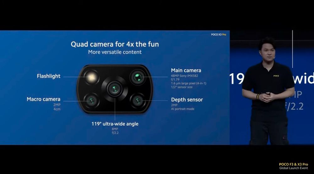POCO X3 Proのカメラは48MPのメインカメラ、8MPで119°の広い範囲が撮影できる超広角カメラ、4cmまで近づける2MPのマクロカメラ、背景ボケ撮影を楽しめる2MPの被写界深度カメラの4カメラ構成!