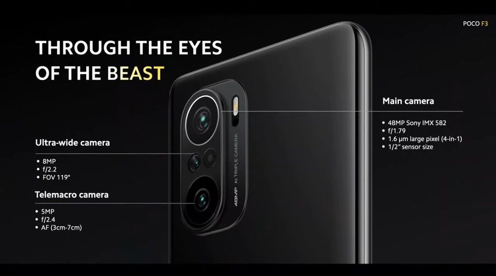 POCO F3のカメラは48MPの通常カメラ、広い範囲を撮影できる8MPの超広角カメラ、接写を楽しめる5MPのマクロカメラのトリプルカメラ搭載!※記事公開当初マクロをポートレートと書いてました。。すみません修正してます!