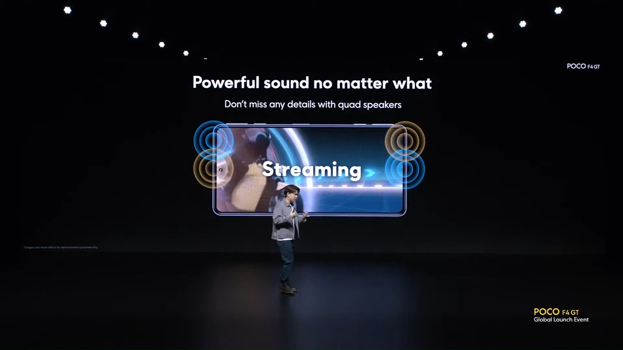 ▼他ハイエンドでもスピーカーは力が入っているんですがこのPOCO F4 GTは別格に思えます。というのも4基のクアッドスピーカーを搭載しているんです!高音、低音とでそれぞれ2基を筐体に突っ込んでおり、サウンドの臨場感は非常に高そうな予感。↓