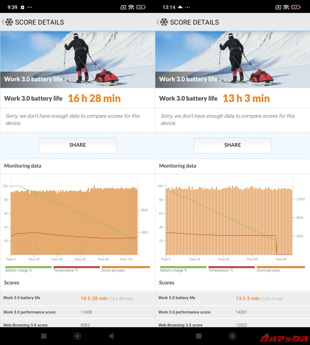 ▼バッテリー持ちはこんな感じ!100%→20%までの電池持ちで左が60Hzで右が120Hz。↓