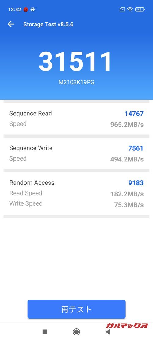 ▼ストレージ速度は読み込みが965.2MB/s、書き込みが494.2MB/s。UFS2.2を採用しているらしいですよ。速度的にはとっても読み込みが速いんで大満足。↓