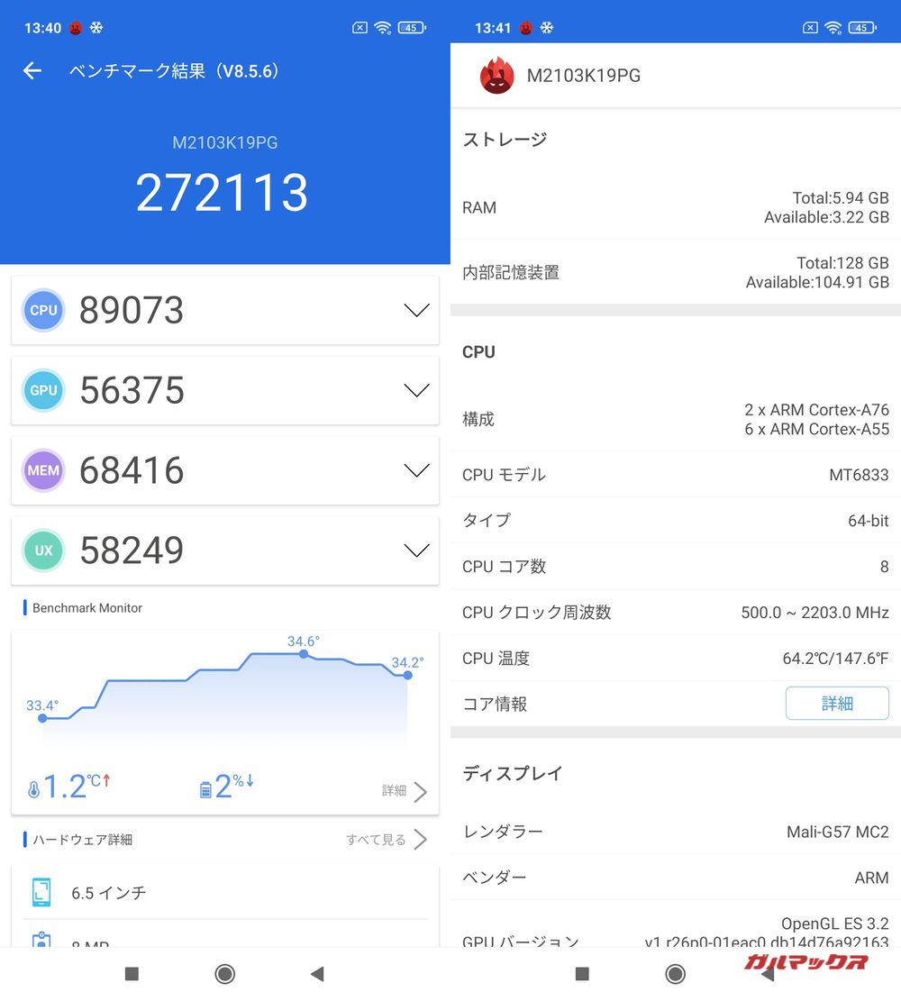 ▼POCO M3 Pro 5Gの実機でAnTuTu(Ver8)を測定しました!総合スコアは272,113点、GPUスコアは56,375点です!発表LIVEでは30万点超えてましたが、恐らくVer9で測定したものと思われます。↓
