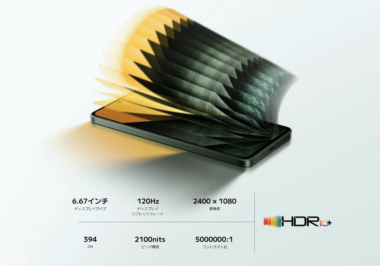 | ディスプレイ | サイズ:6.67インチ 材質:有機EL 画面占有率:92% 形状:パンチホール(中央) 最大リフレッシュレート:120Hz 最大タッチサンプリングレート:240Hz |