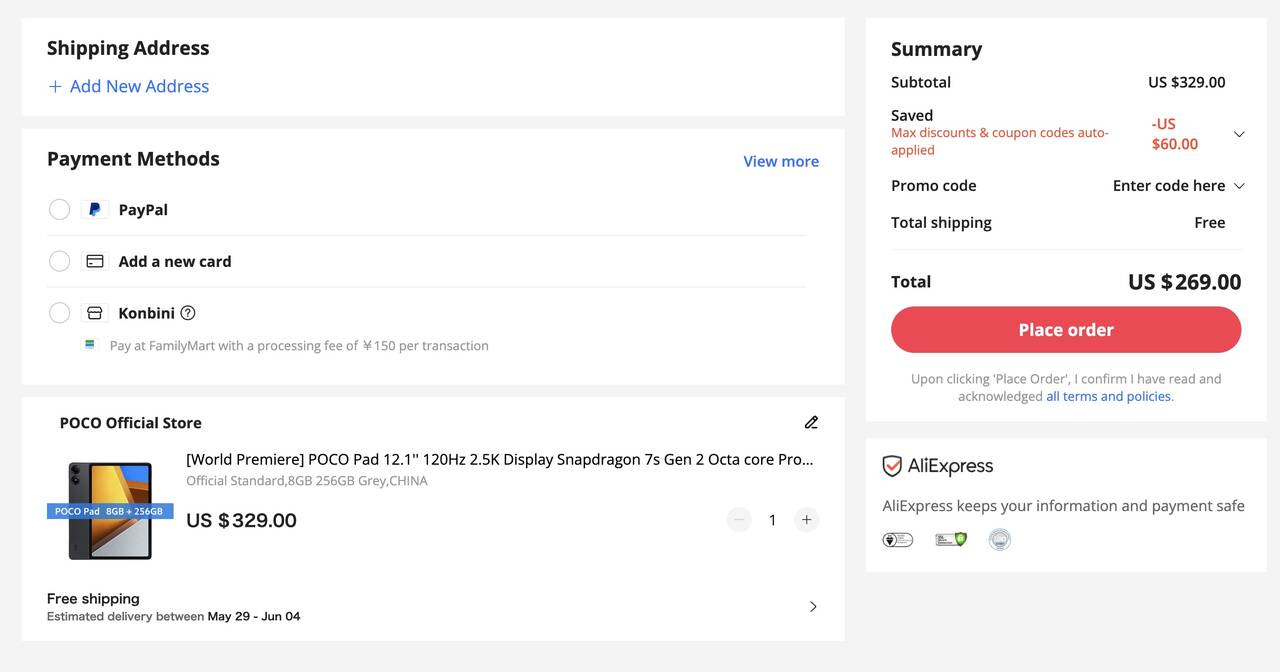 2024年5月23日にPOCOの新製品発表会でお披露目となったPOCO Padですが、AliExpressで初売りセールが始まりました!ストアクーポンを適用するとお値段は269ドルなので日本で買うよりもちょっぴりお得!