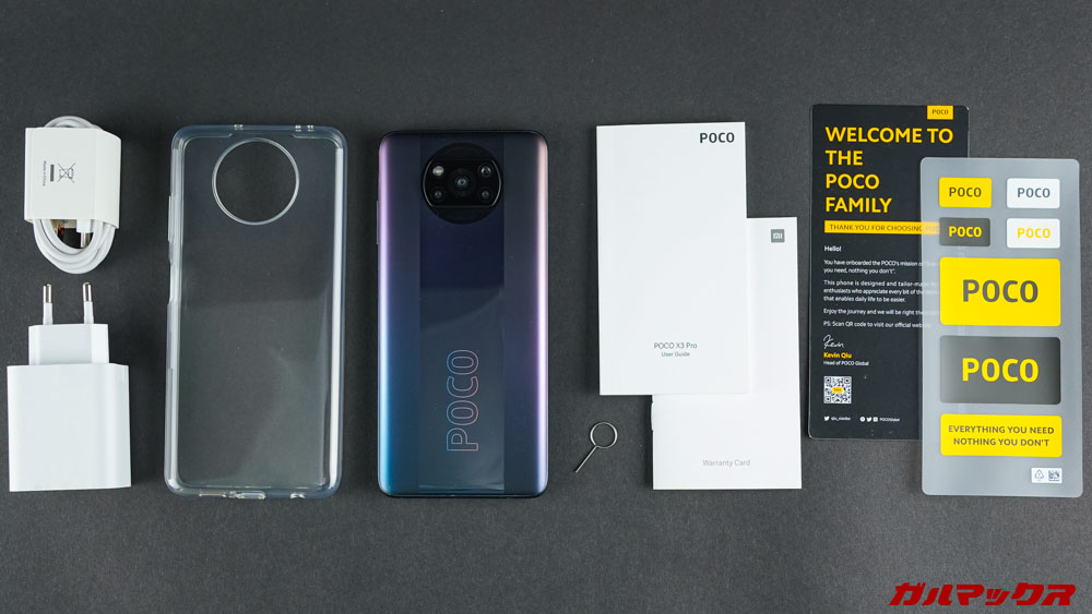 同梱物は充電器、充電ケーブル、説明書類、ケースにSIMピンそしてPOCOステッカー!充電器の形状は日本のコンセントと違うので変換アダプタを用意しましょう!