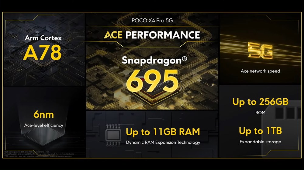 ▼POCO X4 Pro 5GのSoCはSnapdragon 695を採用!また次世代通信規格5Gにも対応しています!メモリと容量は6GB+128GB、8GB+256GBの2通りでハイエンドに引けを取らない搭載量。MicroSDカードに対応しているのもGoodだぜ!↓