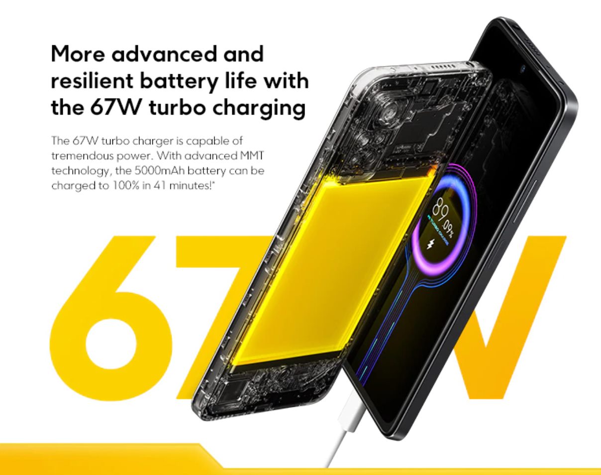 ▼バッテリー容量は5,000mAhと、一般的な水準(3,500~4,000mAh)よりも大容量なのもGood!さらに67Wの急速充電対応!67W充電ではわずか41分ほどで満充電ができるという速さ。↓