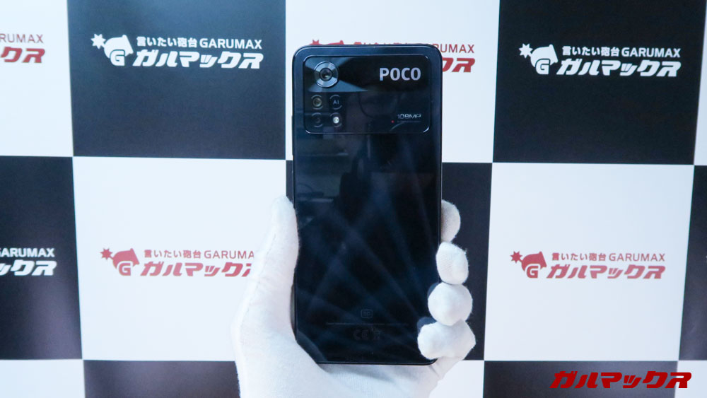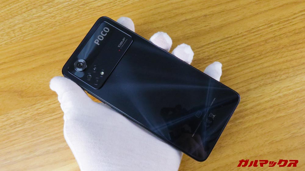 POCO X4 Pro 5Gの背面質感はツルツルなタイプ!カラーはブラックです。
