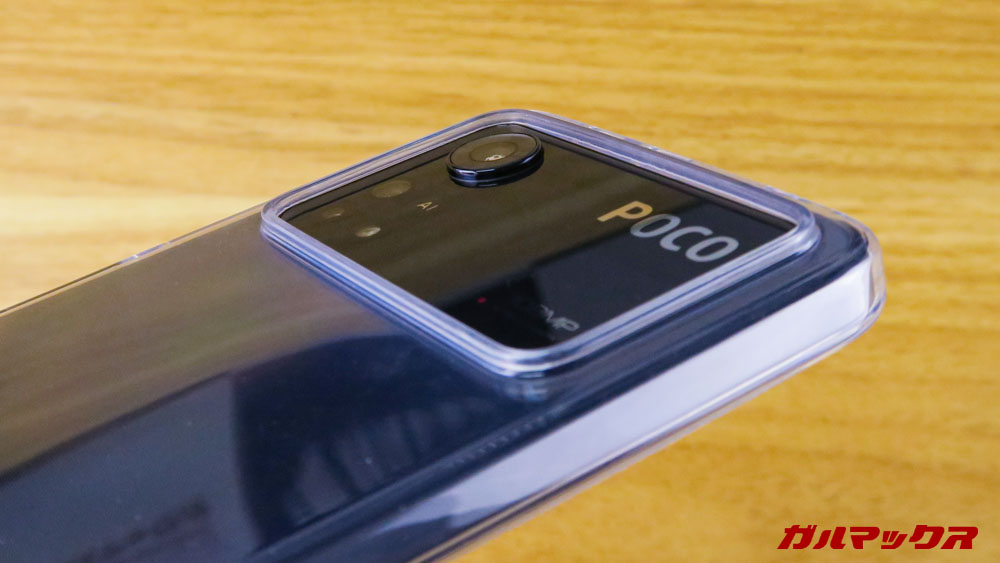 ▼付属のクリアケースを装着しても出っ張りは解消されません。ただメインカメラ部までの厚みはカバーできるので、カメラによって机などにキズはつきにくくなります。↓