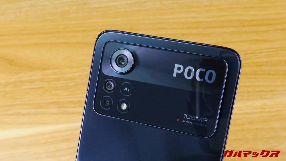 ▼カメラの見た目が特に目を引く部分、というかやりすぎレベルのハデさです。POCOロゴもでかくて目立つ。好みは分かれるでしょうけど、個性派デザインが好きな筆者にとってはアリよりのアリ。↓