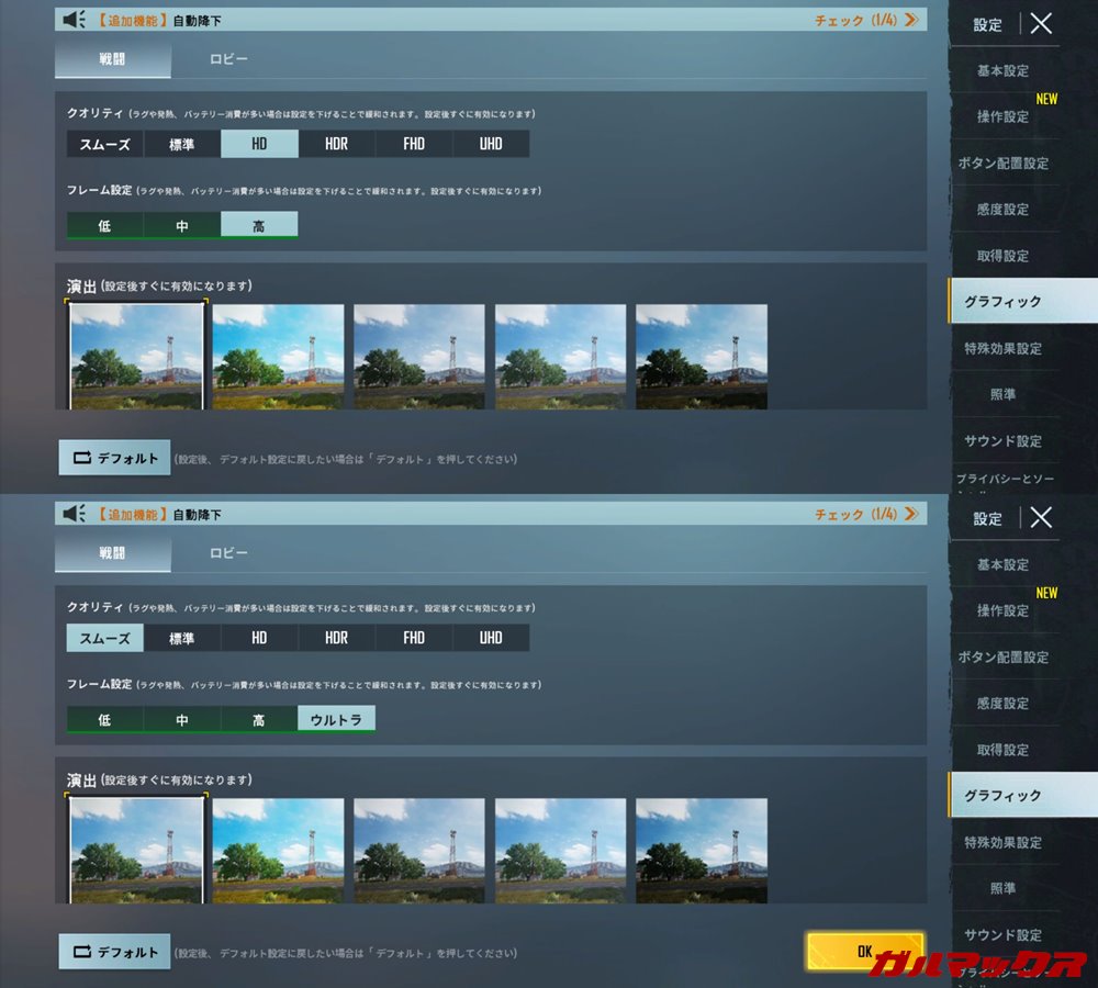 ▼ゲームの性能をチェック!PUBG:Mobileのクオリティ+フレーム設定は初期ではHD+高。残念ながらクオリティを最低のスムーズに落とした場合でも、極限までの設定は対応していませんでした。↓